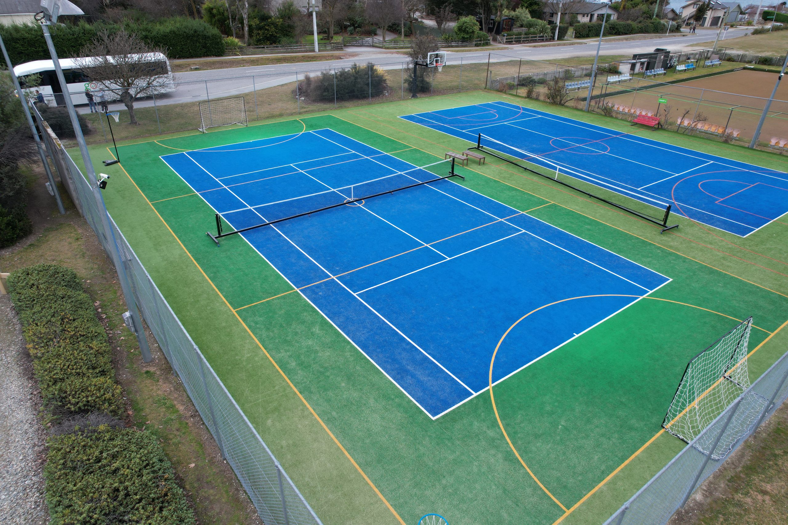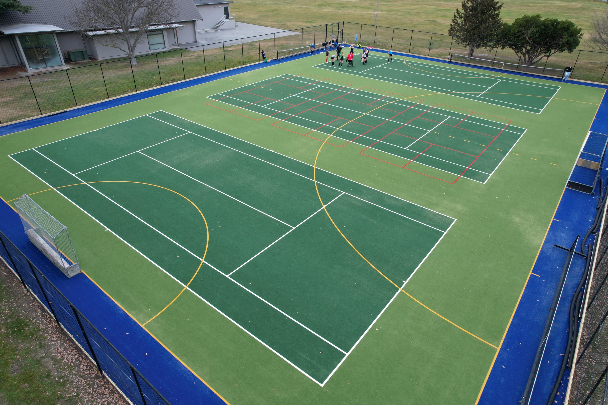 - Tennis courts and netball courts sharing the same surface with practice circles for hockey.